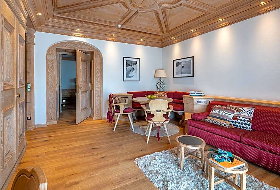 This suite features a large window offering panoramic views of the Engadin mountains. It also comes with a separate living room with a fireplace, a dining area, a kitchenette, a balcony and a private bathroom. The walls are paneled with Arven wood. There is a connecting door to a small single room.